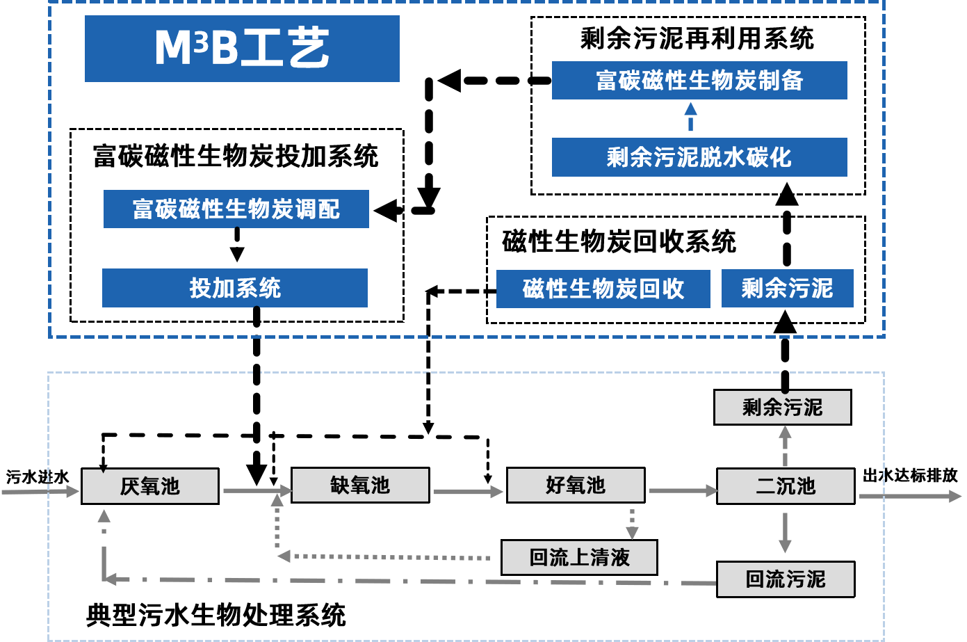 側流深度脫氮除磷工藝的核心,是將污泥裂解碳化工藝的污泥產物改性制成可高效負載微生物的粉末載體,投加 至污水廠的生化系統,形成活性污泥法和生物膜法結合的“雙泥齡”生化系統,借助具有微米級孔隙的富碳磁性生物炭、流場模擬系統、精確曝氣系統、磁回收系統,提高整個生化系統的生化效率。